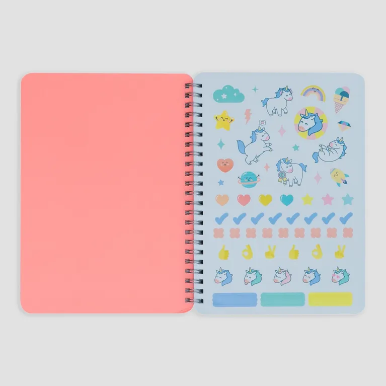 Libreta en tamaño A4 con encuadernación en espiral y pautado en cuadrícula. Con tapa dura y 160 páginas de papel de 80gr. con la certificación FSC, que garantiza que proviene de bosques gestionados de forma responsable. Incluye una hoja de pegatinas. ¡La magia de los unicornios te acompaña para hacer realidad aquello que sueñas!