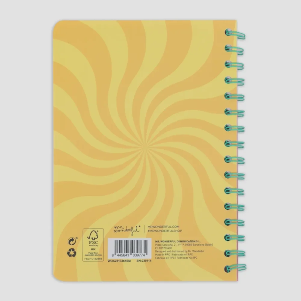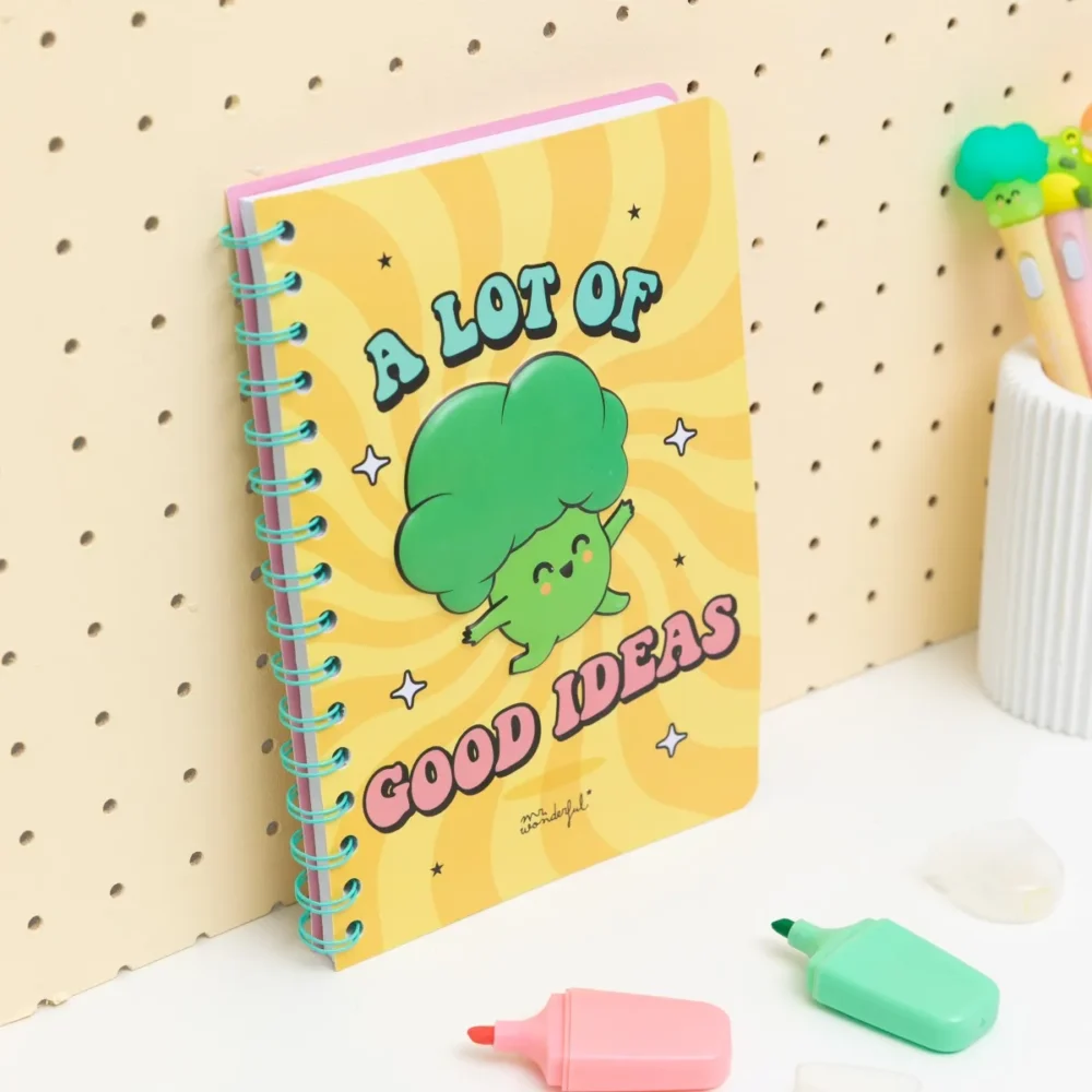 Libreta de tamaño A5, con un brócoli Mr. Wonderful en 3D en ella. Con encuadernación en espiral y 100 páginas de papel blanco, que cuentan todas con un pequeño personaje en forma de brócoli en su esquina inferior derecha. Cuenta con la certificación FSC, que garantiza que han sido fabricados con papel obtenido de bosques gestionados de forma responsable. Llena esta libreta de buenas ideas y acude a ella siempre que necesites inspiración, ¡no fallará!