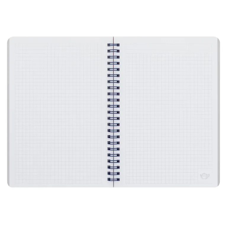 Libreta en tamaño A5 con encuadernación en espiral, tapa dura y 80 hojas cuadriculadas de 80 gr. en su interior. Incluye una hoja de pegatinas.