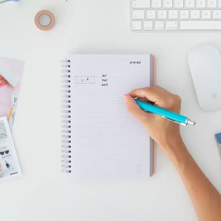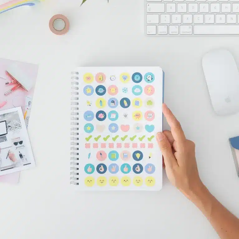 Libreta de tamaño A5, con encuadernación en espiral, tapa dura y 80 hojas a rayas de papel de 80 gr en su interior. Además, contiene una hoja con divertidas pegatinas.