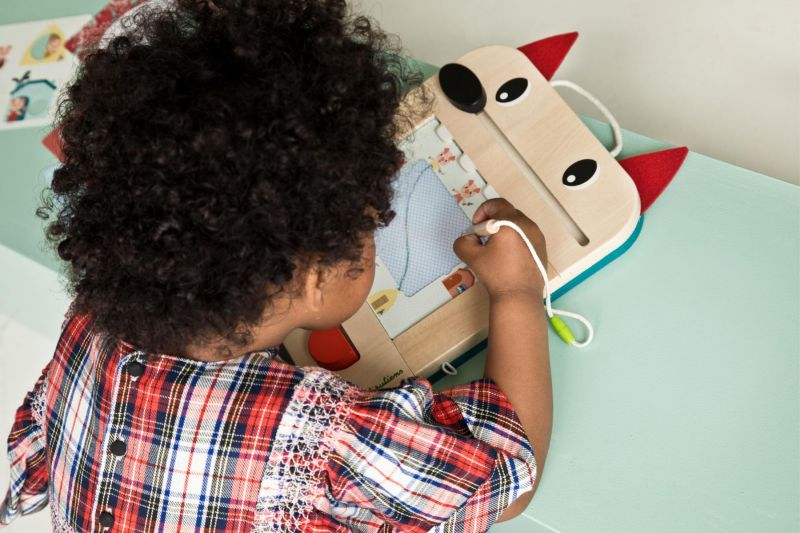 Fabricada con materiales resistentes y de alta calidad, incluye un lápiz magnético unido por un cordón, especialmente diseñado para las manos infantiles, y cuatro formas magnéticas que permiten añadir detalles divertidos a cada dibujo. Su tamaño portátil la hace ideal para llevar en viajes o para entretener al niño en cualquier momento del día.