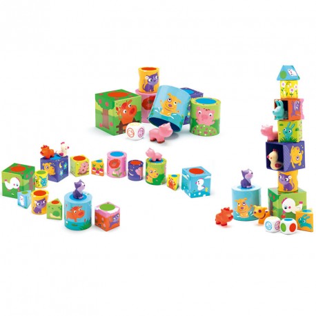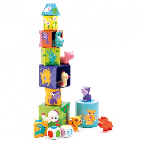 El set incluye 3 adorables animales, cubos apilables y dados de colores, que permiten jugar de tres formas distintas: