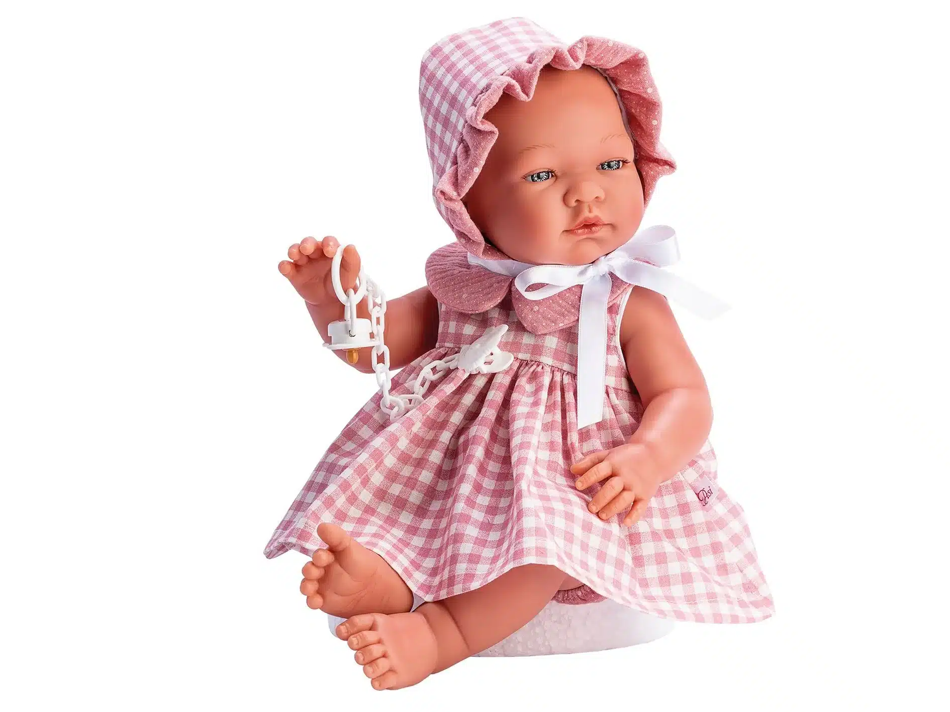 Muñeca María de 43 cm con cuerpo entero de vinilo, vestida con un delicado conjunto de cuadros rosas con pololo y cuello de gasa rosa, ideal para el juego de cuidado y de imitación.
