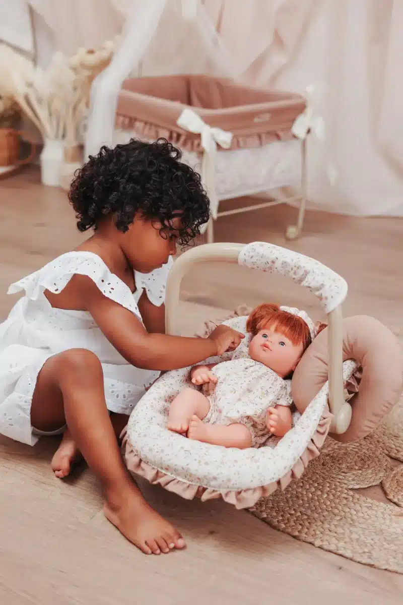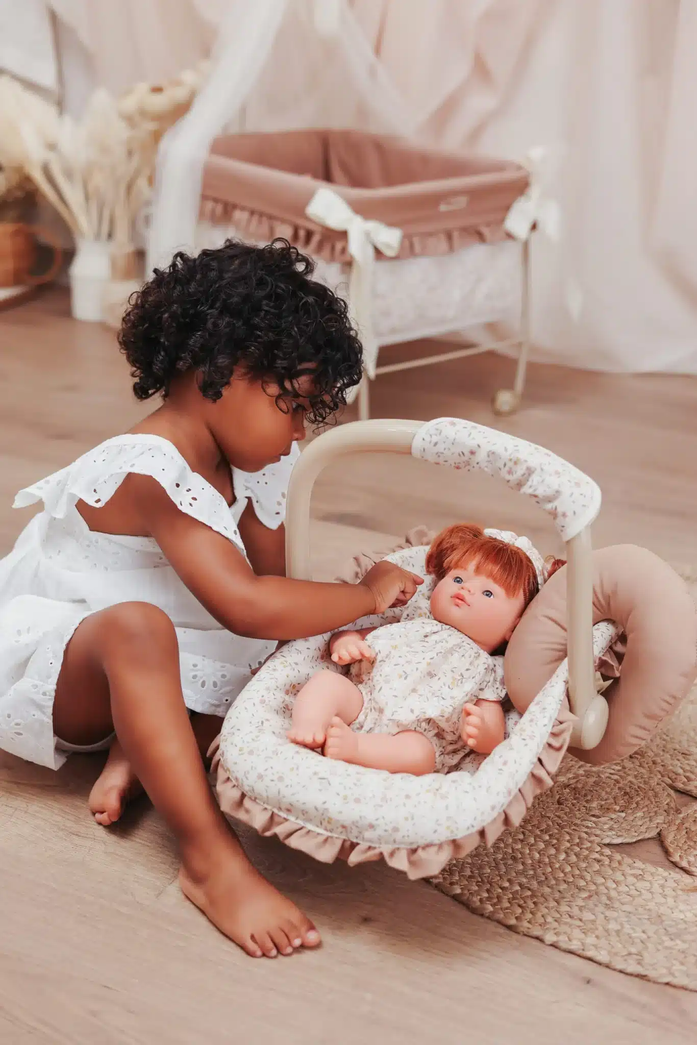Niños y niñas que disfrutan jugando a cuidar y transportar a sus muñecos, recreando rutinas cotidianas de forma realista.