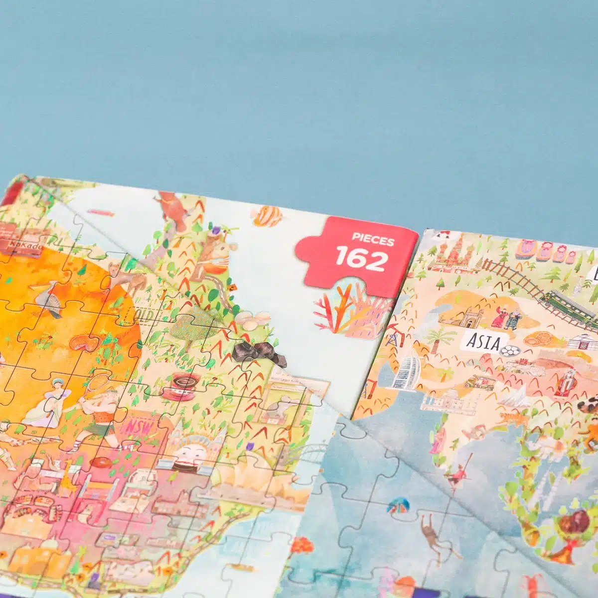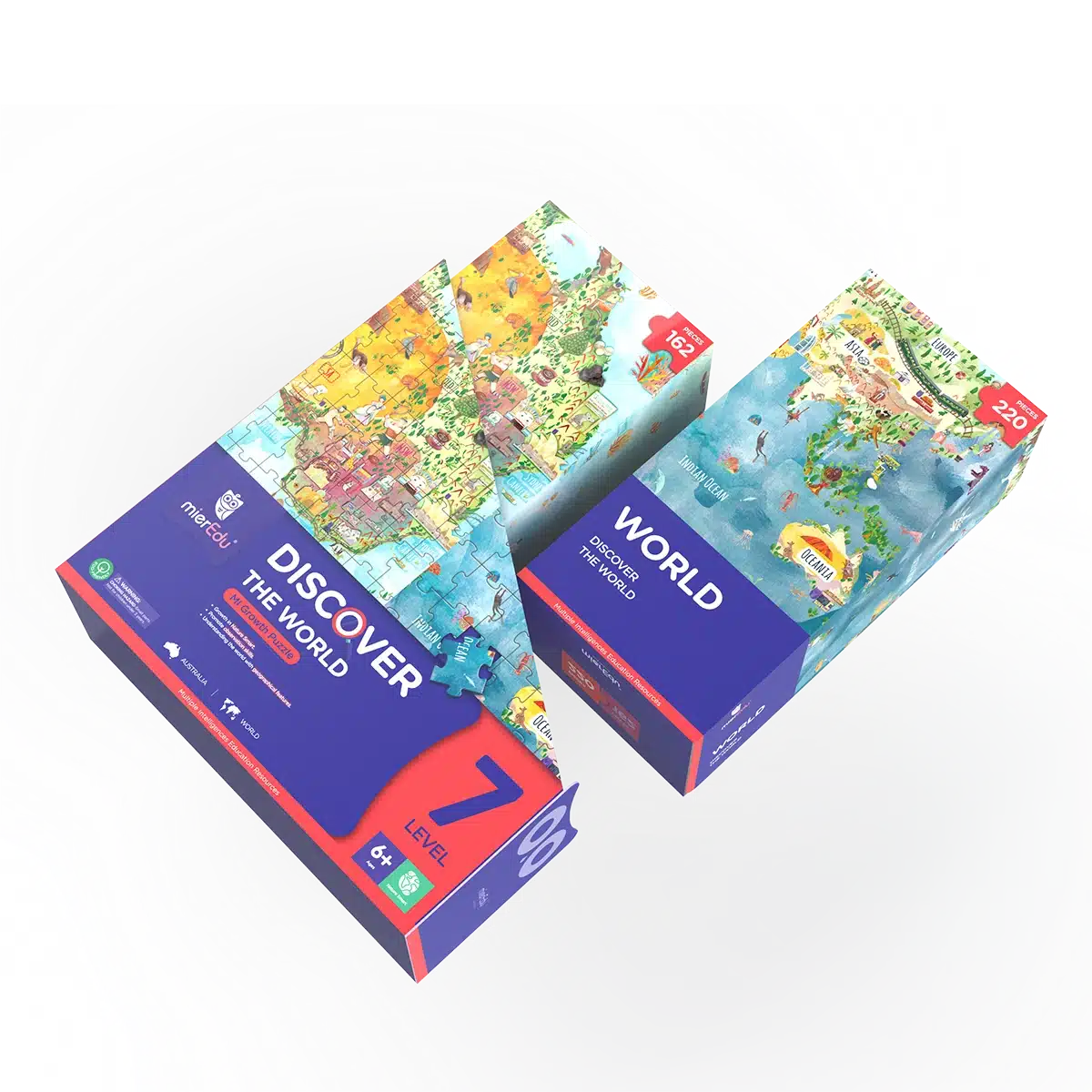 Dos rompecabezas de mapas, World y Australia, llevan a los jóvenes exploradores