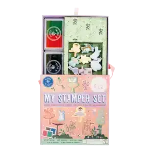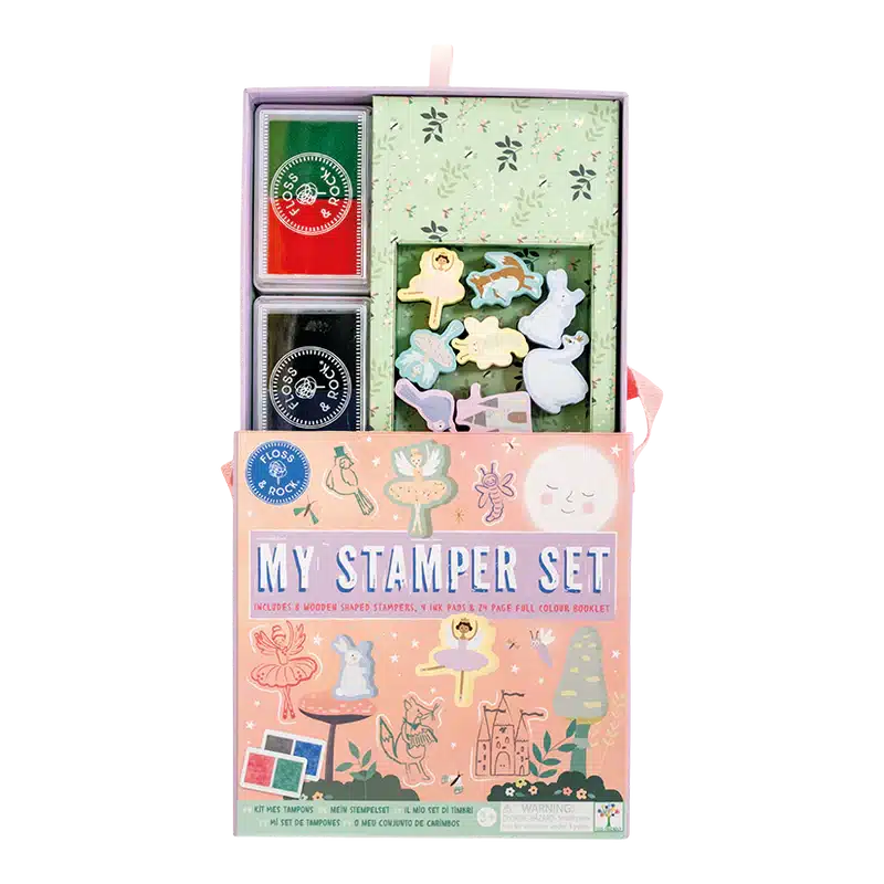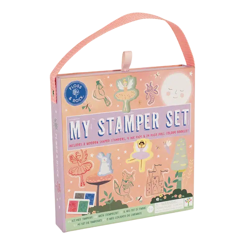 ¡Mucha diversión con los sellos! Sé creativo con el juego My Stamper de Floss & Rock. Inventa escenas y cuenta historias usando los 8 sellos divertidos, las 4 almohadillas de tinta de colores y el folleto a todo color de 24 páginas, todo guardado cuidadosamente dentro del cajón extraíble dentro de un práctico estuche de transporte.