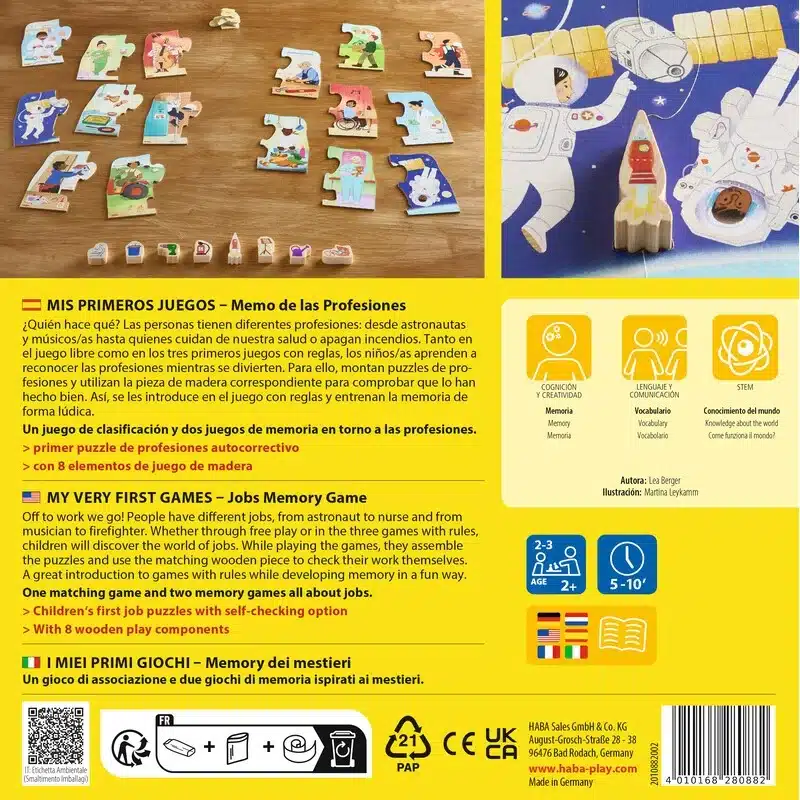 Mis Primeros Juegos: Memo de las Profesiones es un juego de mesa para niños que presenta varias variantes, incluido el juego libre y la construcción de puzzles.