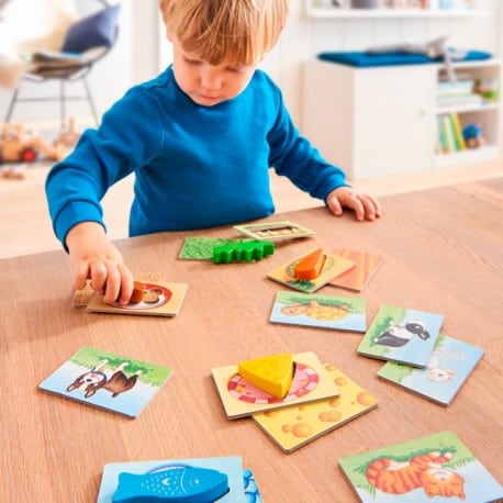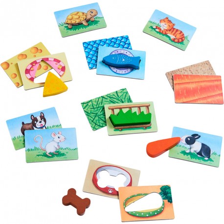 ¿Qué comen los gatos, las tortugas o los ratones? ¿Y qué comida es la preferida de los conejos y de los perros? Esto es lo que intentan averiguar los niños y las niñas clasificando en este juego cooperativo las cartas de animales, las piezas de madera y las cartas con diferentes formas y colores.