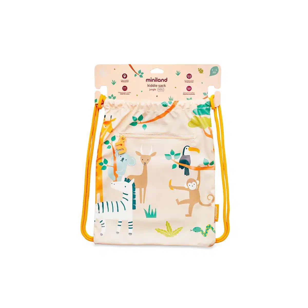 La Kiddie Sack Jungle de Miniland es una mochila tipo saco diseñada especialmente para los más pequeños. Gracias a su sistema de cierre con cordón ajustable, los niños pueden abrirla y cerrarla fácilmente, fomentando su independencia y haciendo que llevar sus cosas sea más divertido.🎒🧒