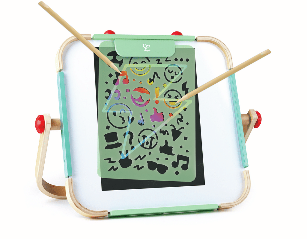 Lleva los garabatos a un nivel completamente nuevo con este increíble juego de rayado. Coloca las plantillas sobre las hojas incluidas y rasca con un lápiz de madera para descubrir las diferentes capas de color que hay debajo. Incluye un póster con consejos y sugerencias. Perfecto para usar en el caballete de sobremesa Hape.