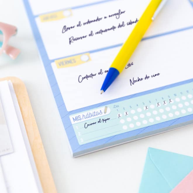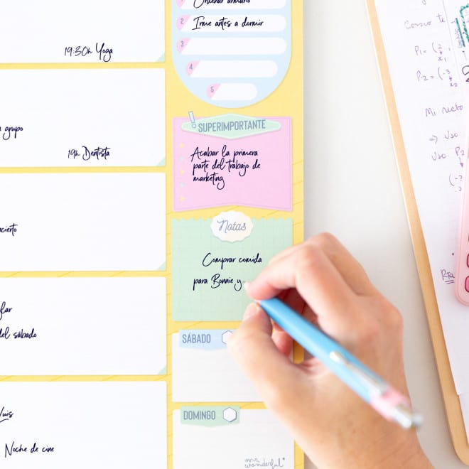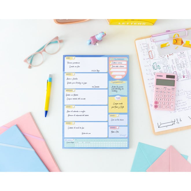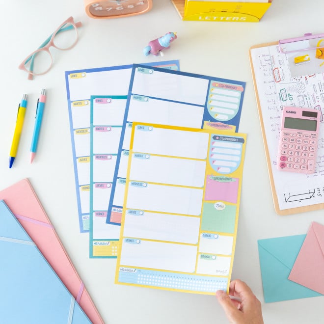 Organizador semanal vertical, sin fecha. Contiene 120 páginas encoladas con 4 diseños distintos y 4 hojas de pegatinas. Tamaño: 21 x 29,7 cm.