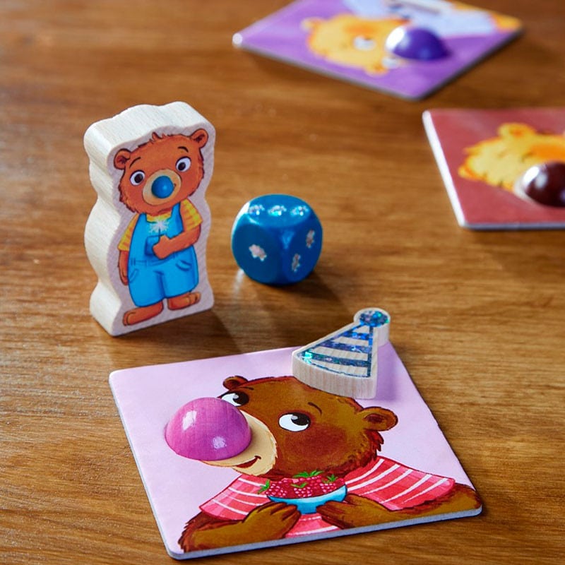 Un juego de dados en el que, por turnos, deberemos lograr deshacernos de las 6 cartas de osos que tengamos en la mano, colocándolas sobre la nariz del color correspondiente.