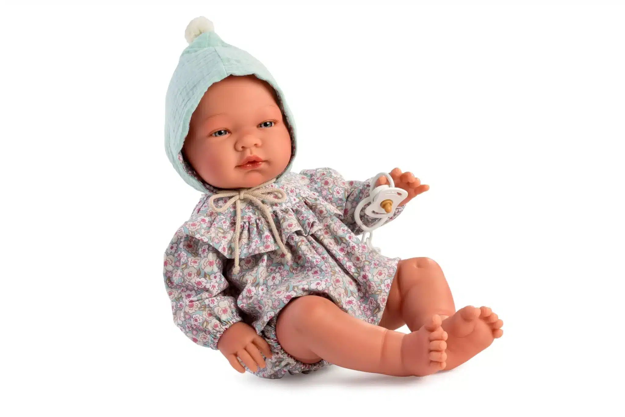 Muñeco Pablo de 43 cm con cuerpo entero de vinilo, vestido con un delicado pelele con volante y flores y gorro verde mint a juego, ideal para el juego de cuidado y de imitación.