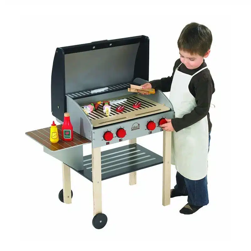 Una completa parrilla infantil de madera con accesorios para que los niños disfruten del juego simbólico cocinando a la parrilla como los mayores.