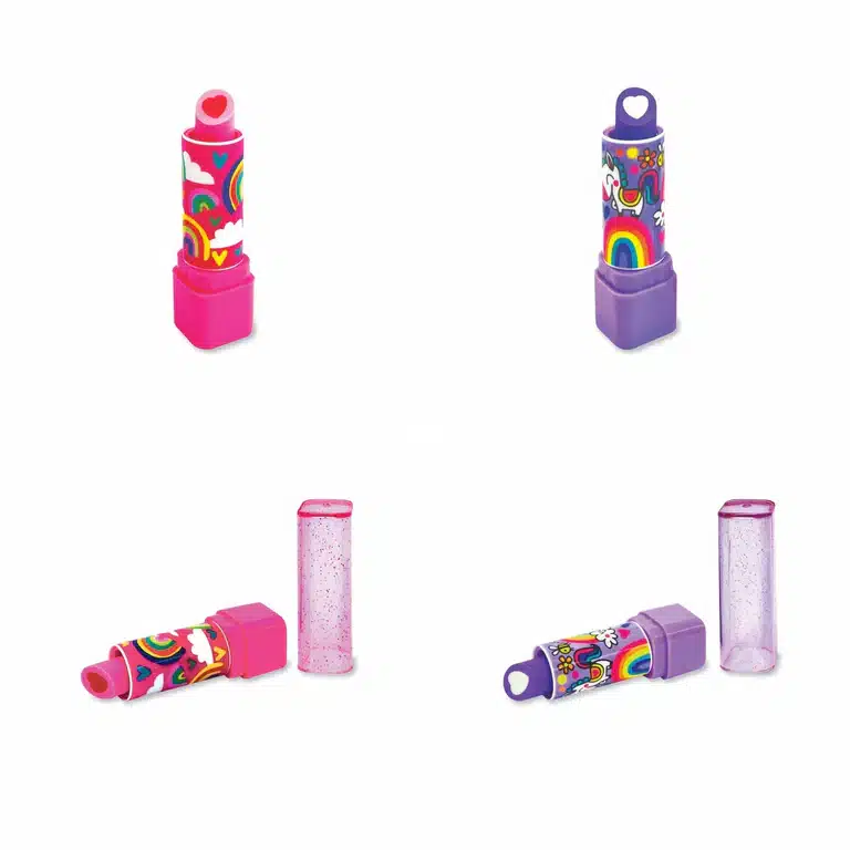 Estos borradores coloridos con forma de lápiz labial son ideales para rellenar las bolsas de fiesta. El borrador se mueve hacia arriba y hacia abajo como un lápiz labial real, lo que los hace útiles y divertidos. Disponibles en dos diseños brillantes: arcoíris y unicornios mágicos, ¡tienen tapas brillantes!
