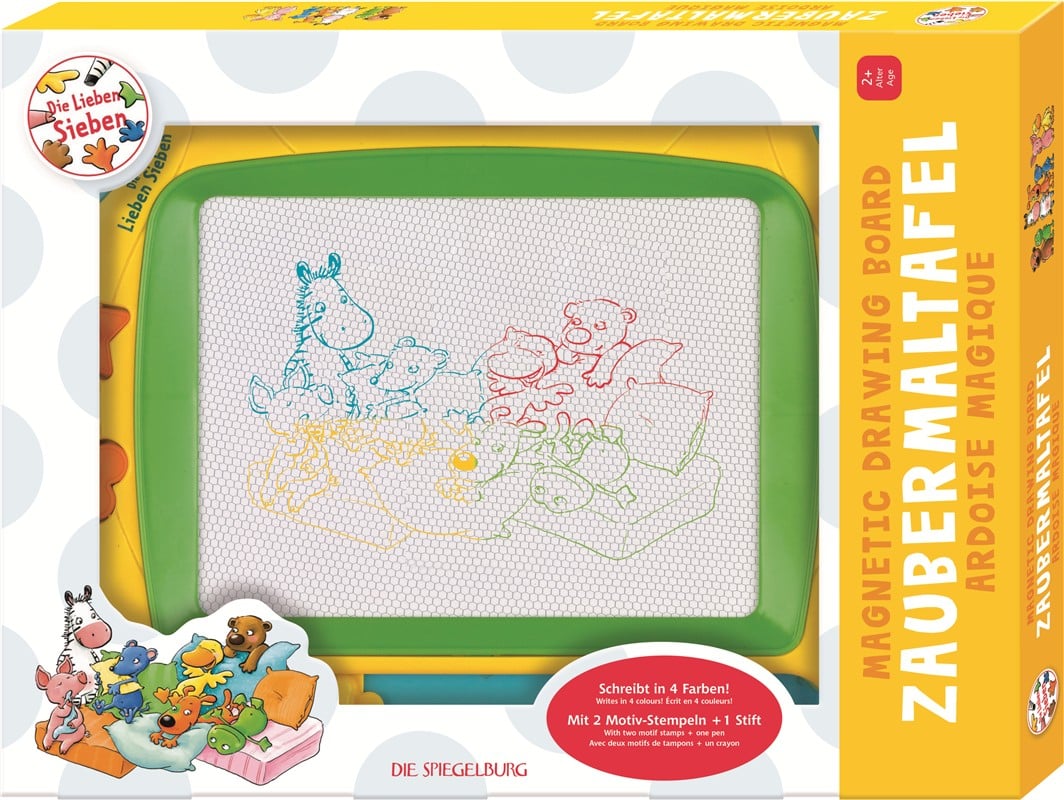 La pizarra mágica The Friendly Seven es el compañero perfecto para los pequeños artistas. Con su superficie de escritura multicolor (verde, rojo, amarillo y azul), permite crear dibujos y letras que cobran vida al instante. Incluye dos sellos con formas y un bolígrafo magnético, todo integrado en una estructura resistente de plástico.