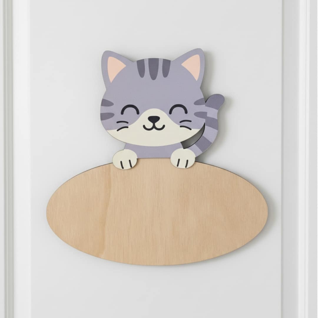 Una placa decorativa en madera sostenible con diseño de gato, personalizable con nombre. Ideal para puertas, paredes y habitaciones infantiles con un toque tierno y especial.