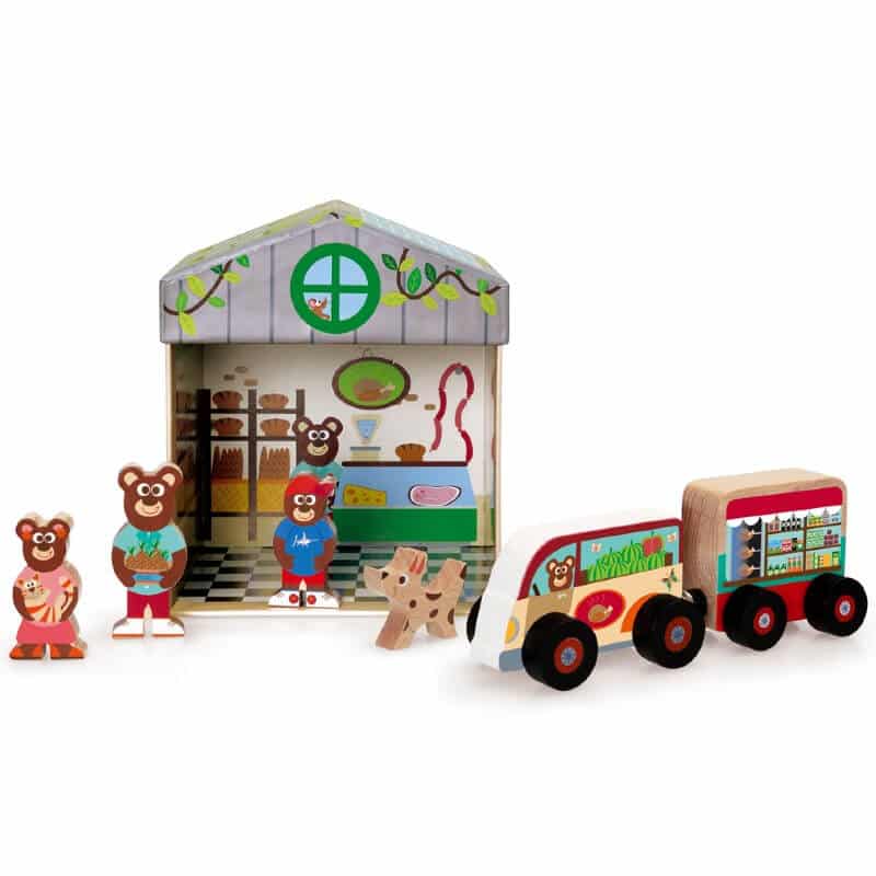 Un nuevo día en la tienda de la familia oso. Papá oso se pone en marcha con el puesto del mercado y lo sujeta a la furgoneta de reparto con ayuda de un imán mientras los otros osos permanecen dentro de la tienda. Descubre toda la mercancía que hay en su interior. Puedes transformar la caja en una casita de juegos, que resulta muy práctica para guardar tus juguetes cuando termines de jugar. La caja está hecha de cartón resistente e incluye 4 figuras de madera, una furgoneta de reparto y un remolque (magnético).