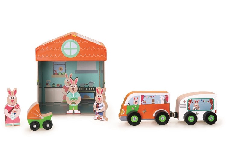 La caja de cartón se transforma en una casa, incluye auto con casa rodante, coche de autobús y familia de conejos de 3 pcs de madera
