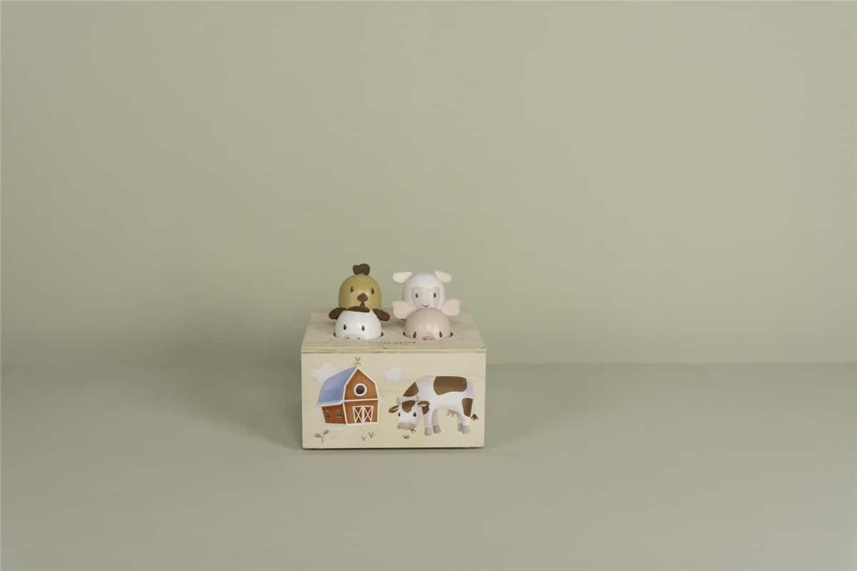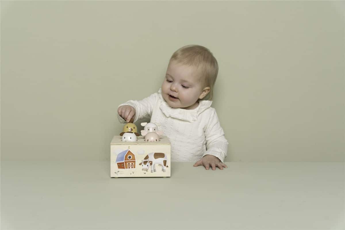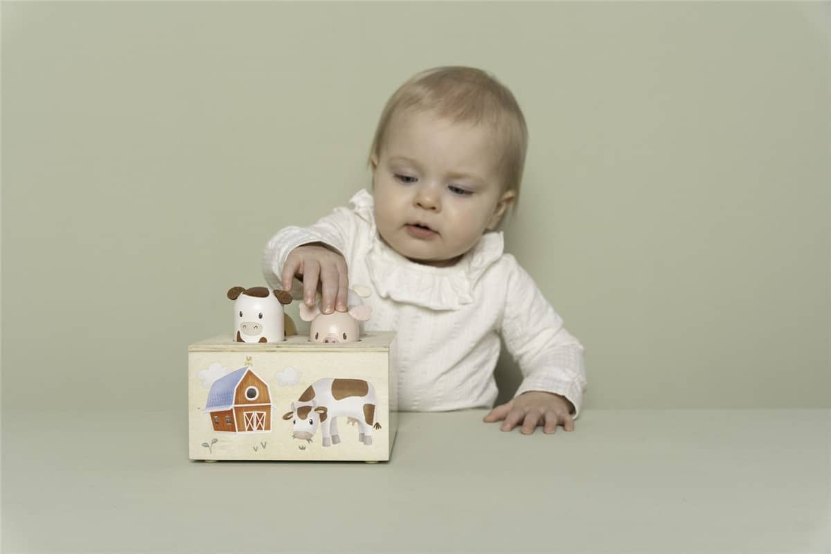 ¿Qué pasa, pequeño granjero? Estos cuatro animales de granja están listos para jugar. Con un suave empujón, un animal entra y el otro sale. Descubre todos los animales y combina sus sonidos: el suave mugido de la vaca, el suave baa de la oveja, el gruñido del cerdo y el cloqueo del pollo. La resistente caja de madera de este juguete emergente interactivo está adornada con simpáticas ilustraciones de la Pequeña Granja, diseñadas para cautivar la imaginación de tu pequeño. Los alentadores sonidos de los animales y los divertidos movimientos emergentes de las cabezas de los animales proporcionan un gran entretenimiento y ayudarán a mejorar las capacidades cognitivas de una manera lúdica.