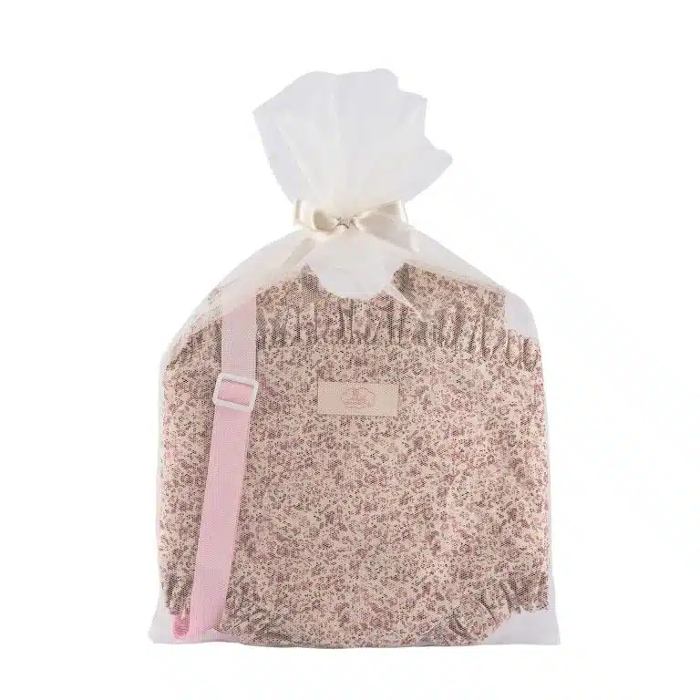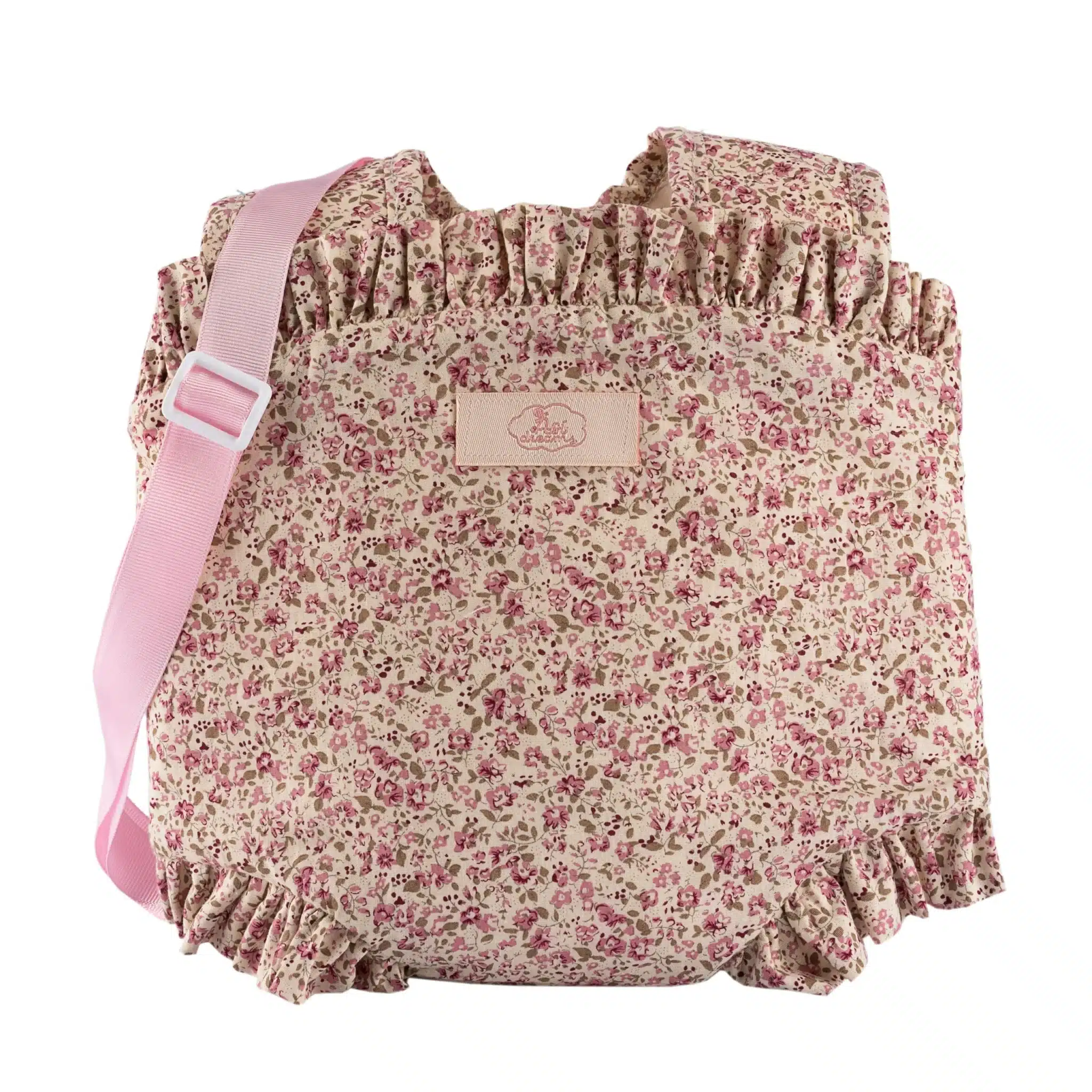 Está confeccionado en tela de algodón suave y resistente, con volante doble que aporta un acabado cuidado y agradable al tacto. Incluye una bolsa de tul con lazo beige, perfecta para guardar la mochila o transportar los muñecos y accesorios cuando no se está utilizando.