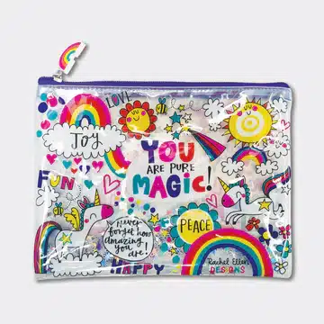 Estas carteras planas con cremallera, con diseño de flores, corazones y estrellas, tienen varios usos: desde estuches para lápices hasta neceseres, carteras para pasaportes y neceseres para pasar la noche. Los diseños de colores brillantes están impresos en un sustrato transparente, muy útil para ver lo que hay dentro, y hemos agregado estrellas plateadas encapsuladas en el panel frontal que se mueven, junto con un lindo tirador de cremallera con arcoíris.