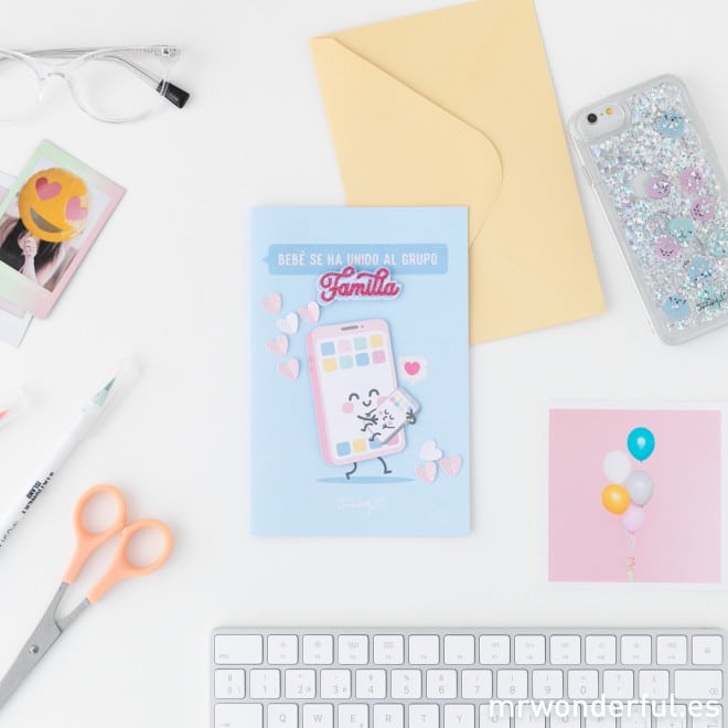 Administrador del grupo, estate atento porque ya está aquí. Ya ha llegado el nuevo miembro de la familia que llevabais esperando todos estos meses. Si es que acaba de llegar y ya tiene acumulados millones de likes, ¡y followers no le faltan! Porque familia que tiene grupo de Whatsapp, familia que permanece unida, y ahora que “Bebé” se ha unido a la fiesta, ¡todavía más! Ahora solo queda pensar qué detalle es el ideal para recibirle como toca, y esta moderna y divertida postal es un acierto más que asegurado. Ya sea para regalarla solita dedicando unas bonitas palabras o para complementar otro regalo, estamos seguros de que les sacará una gran sonrisa… ¡a los tres! Fabricada con materiales y tintas especiales, sus acabados son de calidad y su diseño con detalles en purpurina y con los móviles protagonistas y corazones en relieve, la hacen única y muy diferente a las típicas postales. En su interior, puedes contar con espacio para inspirarte y escribir una bonita dedicatoria, o en el caso de que seáis un grupito, firmar todos felicitándoles en el que es uno de los momentos más increíbles de sus vidas. Además, viene con un sobre en el que podréis meterla para que no se estropee y se enamoren nada más abrirlo al ver esta maravillosa postal.
