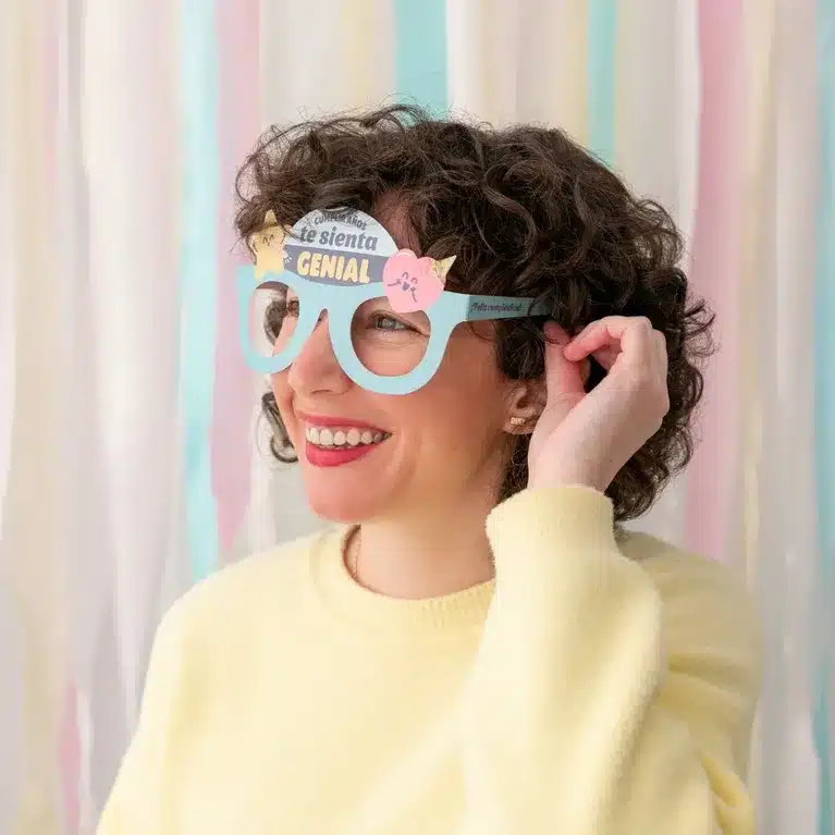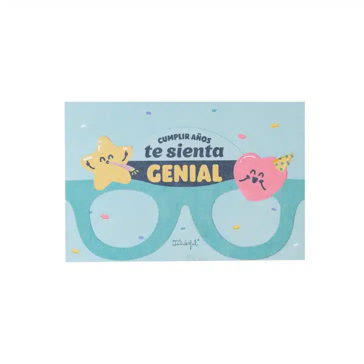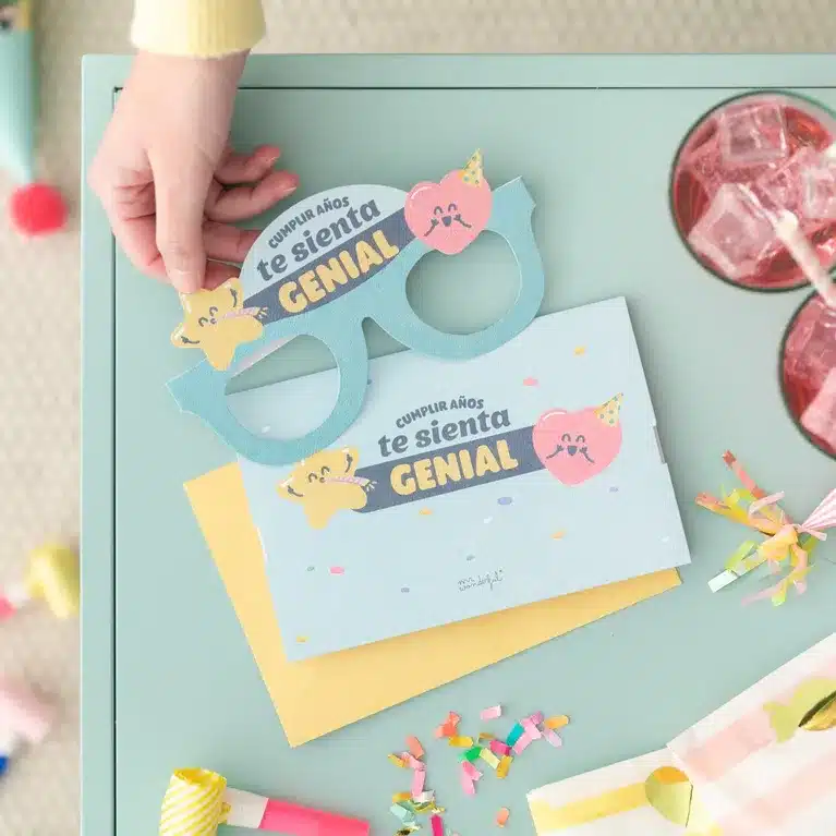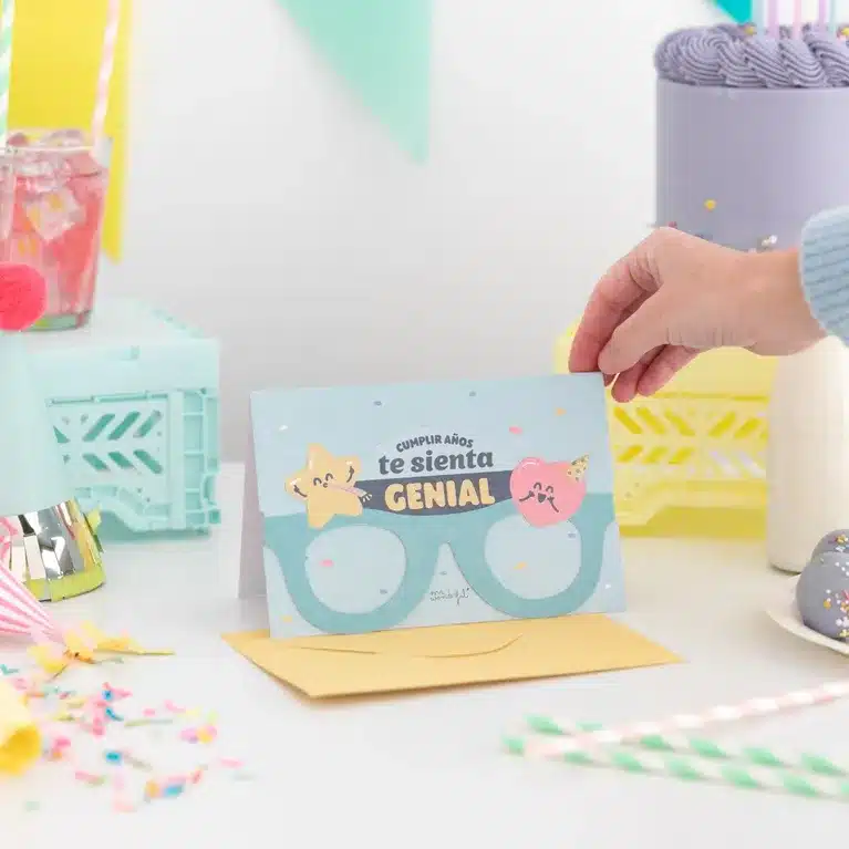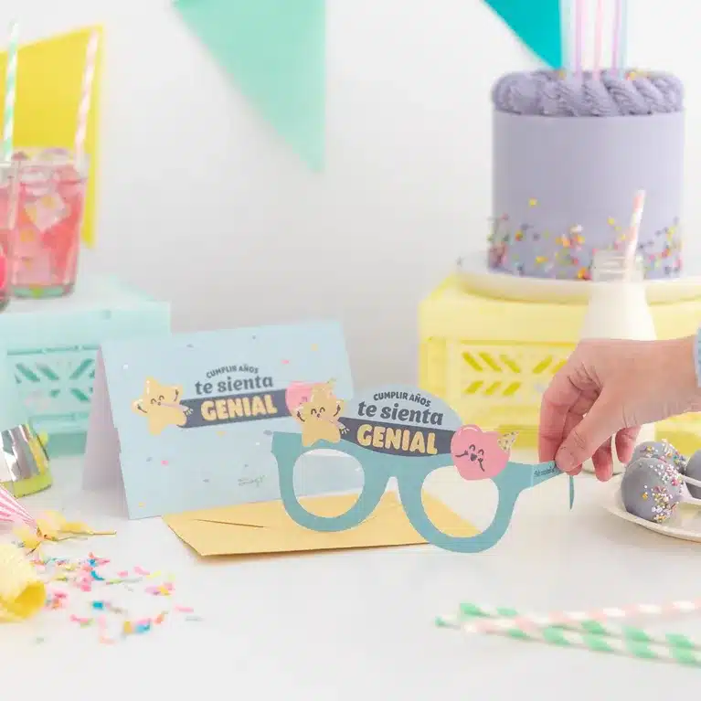 – Postal con mensaje de cumpleaños. Incluye unas gafas de cartón festivas para que la persona que cumple años se las ponga.