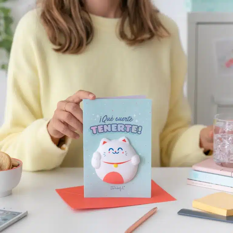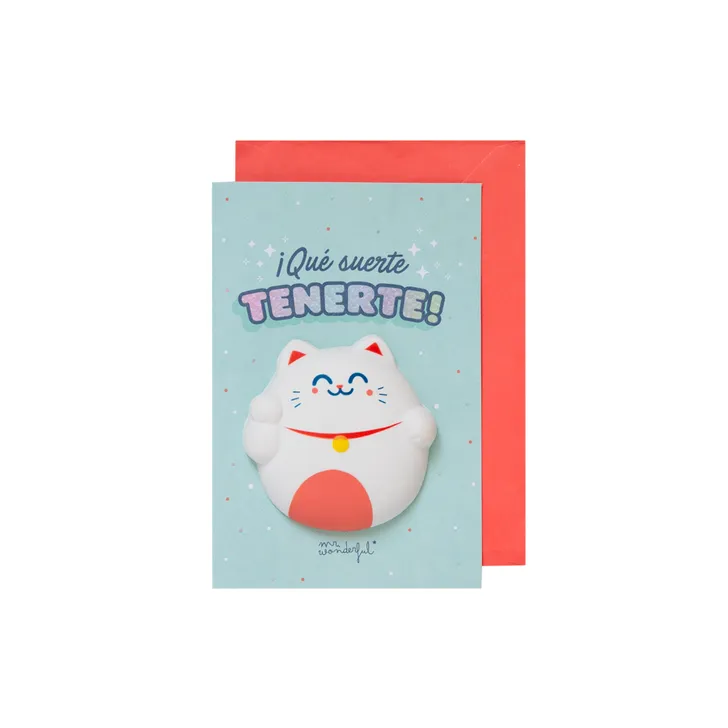 Postal original tiene un diseño muy wonder, con nuestro gato de la suerte con squishy en la portada. Incluye sobre