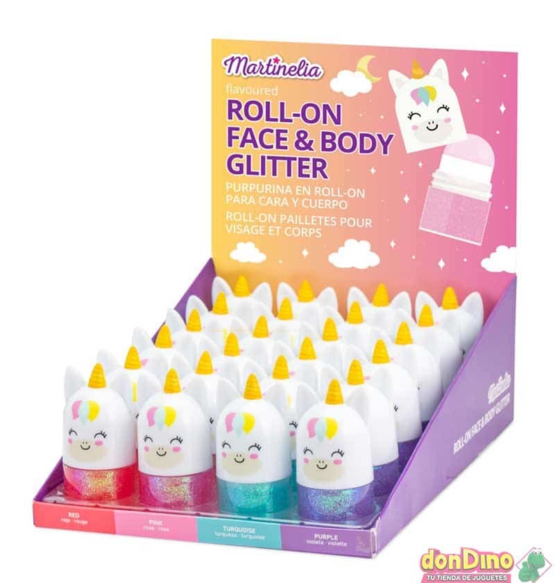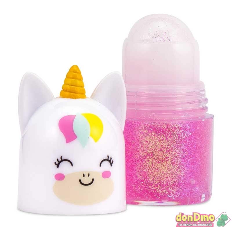 Una purpurina en formato roll-on con diseño de unicornio, perfecta para que los niños y niñas añadan un toque de fantasía a su piel de forma lúdica y segura.