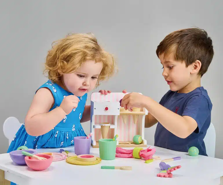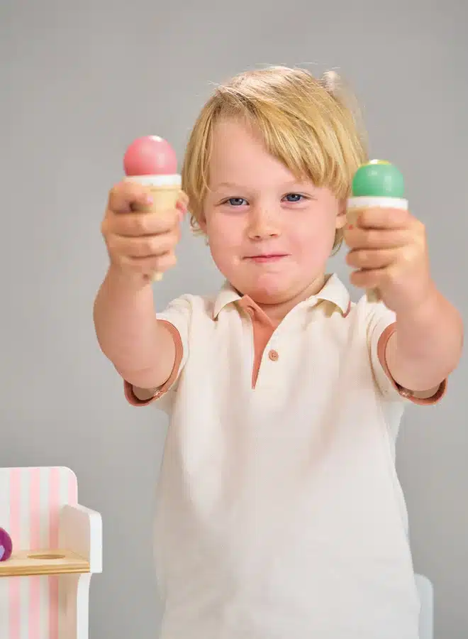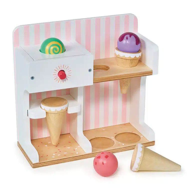 Una minitienda con tres cucuruchos de madera y tres cucharas para helado, para mezclar y combinar en un juego de simulación de compras. ¡Crea tu cucurucho de helado perfecto presionando el botón rojo y dejando que la cuchara caiga mágicamente sobre el cucurucho!