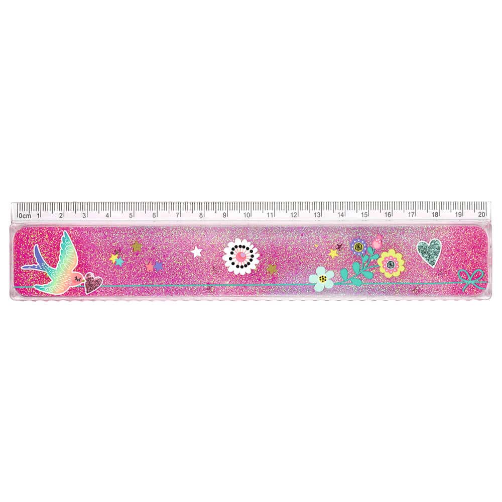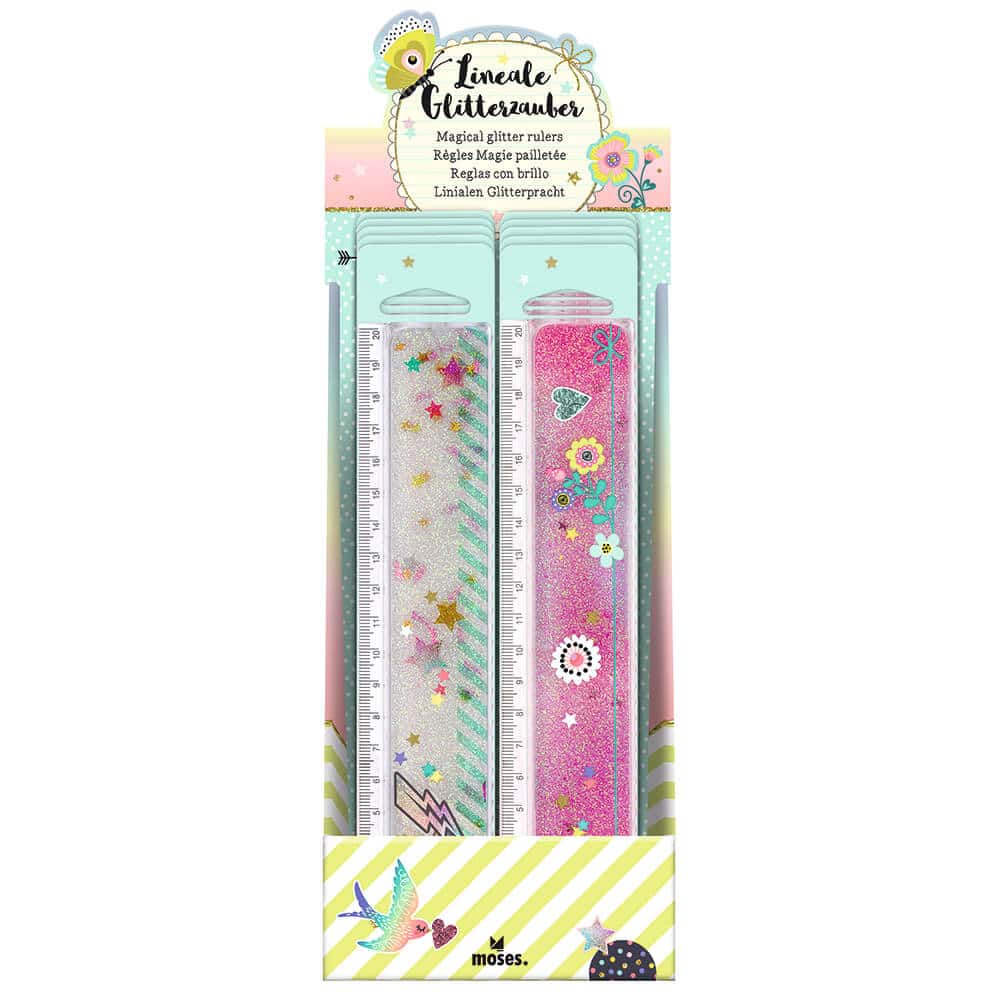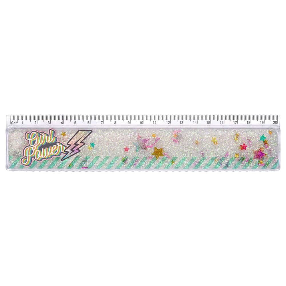 Regla de 20cm con purpurina en su interior disponible en dos modelos diferentes.