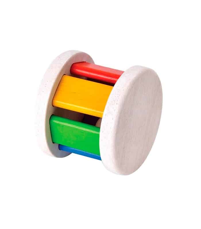 Sonajero de madera multicolor con forma cilíndrical. Al rodar o agitarlo la pequeña bola de madera de su interior desarrollará las habilidades auditivas y de atención de tu bebé.