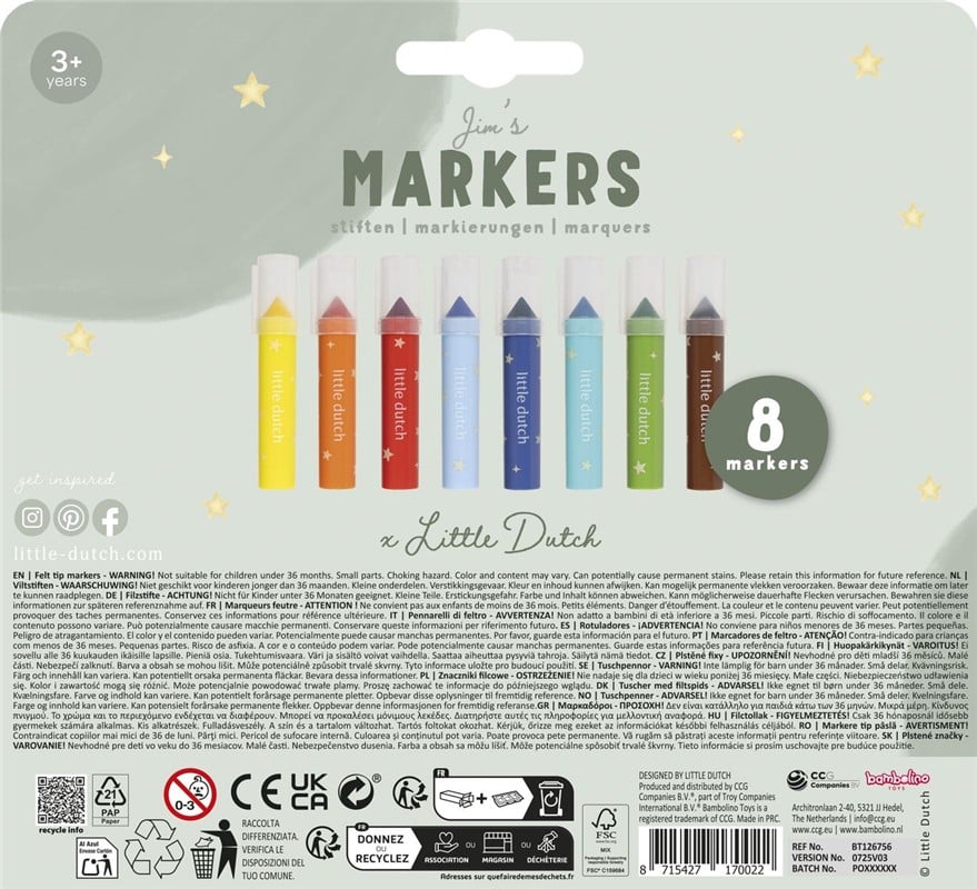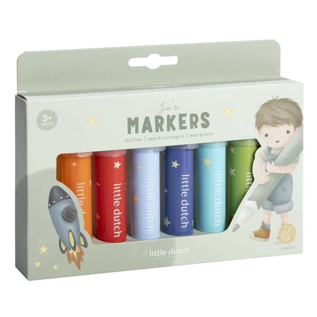 Rotuladores de Punta de Fieltro Jim – Set de 8 rotuladores lavables – Little Dutch – Creatividad y precisión desde 3 años