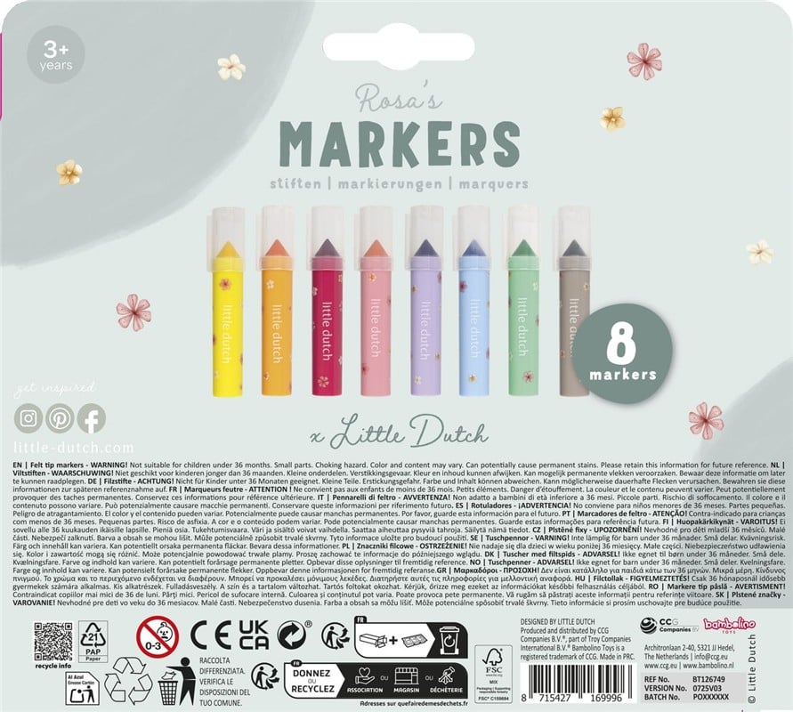 Los Rotuladores de Punta de Fieltro Rosa de Little Dutch son el material perfecto para acompañar los primeros pasos de los niños en el mundo del dibujo y el color. Inspirados en la encantadora colección Rosa, este set incluye 8 rotuladores de colores brillantes con punta de fieltro resistente, pensados para estimular la creatividad y el desarrollo artístico desde edades tempranas.
