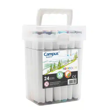 El set de 24 rotuladores de doble punta Campus Student TopiColor es perfecto para quienes buscan versatilidad y calidad en sus trabajos artísticos, escolares o de oficina. Cada rotulador cuenta con punta fina para detalles precisos y líneas suaves, y punta gruesa y biselada para rellenar, colorear o subrayar áreas amplias.