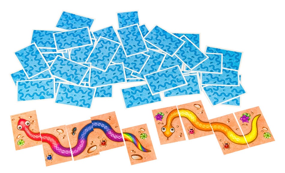 ¿Quién puede ayudar a poner los colores en orden? Rojo con rojo, azul con azul, amarillo con amarillo… ¡Es fácil! ¿verdad? Completad las serpientes con cabeza, cuerpo y cola y llevároslas a vuestro montón. ¡El que consiga más cartas al final de la partida es el ganador!