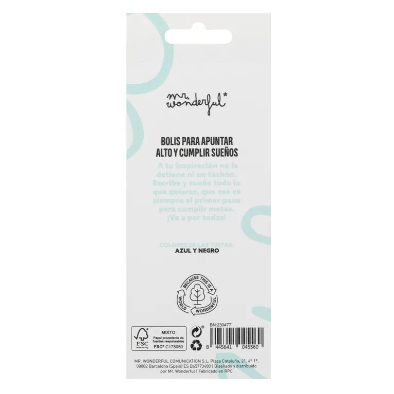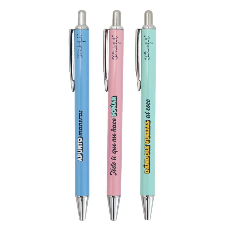 Set de 3 bolis Mr. Wonderful con mensaje : «Dándole vueltas al coco»/»Todo lo que me hace soñar» / «Apunto maneras». La combinación perfecta de tintas negra y azul.