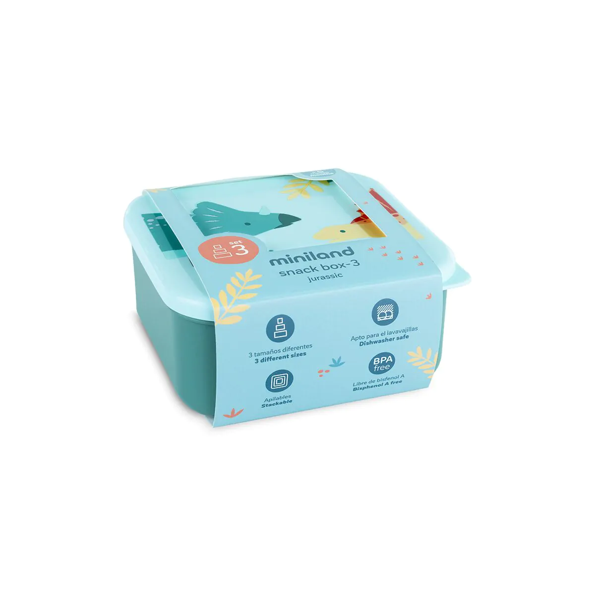 El set de 3 cajas de snack Jurassic de Miniland es la solución perfecta para llevar pequeños alimentos organizados a cualquier parte. Cada caja cuenta con un tamaño distinto, ideal para separar fruta, galletas, frutos secos u otros snacks. Su diseño con divertidos dinosaurios las convierte en un accesorio irresistible para los peques.🦕🌿