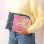– Set de 3 neceseres con mensaje, cierre con cremallera y acabado glitter.