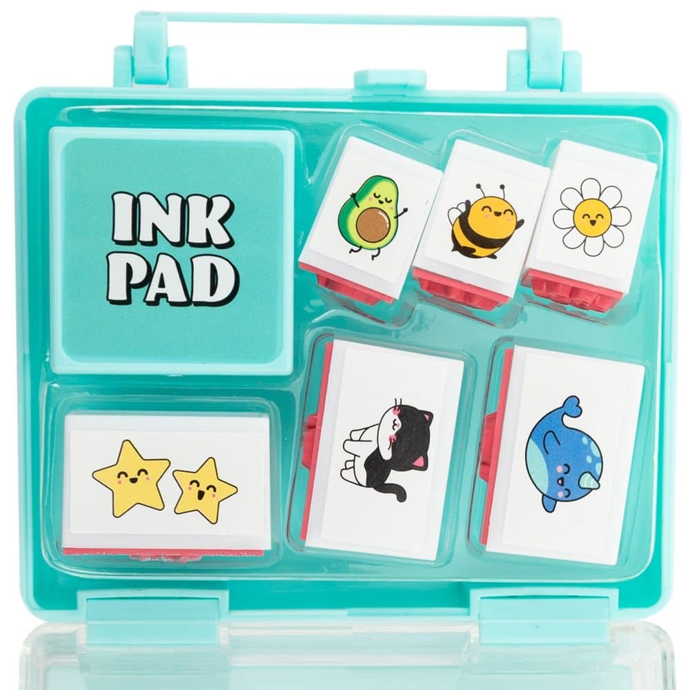 Pequeño maletín de plástico que contiene 6 sellos que estampan a 6 de nuestros personajes favoritos: margarita, abeja, aguacate, gato, narval y dos estrellitas._x000D_ Contiene además un tampón de tinta azul para estampar.