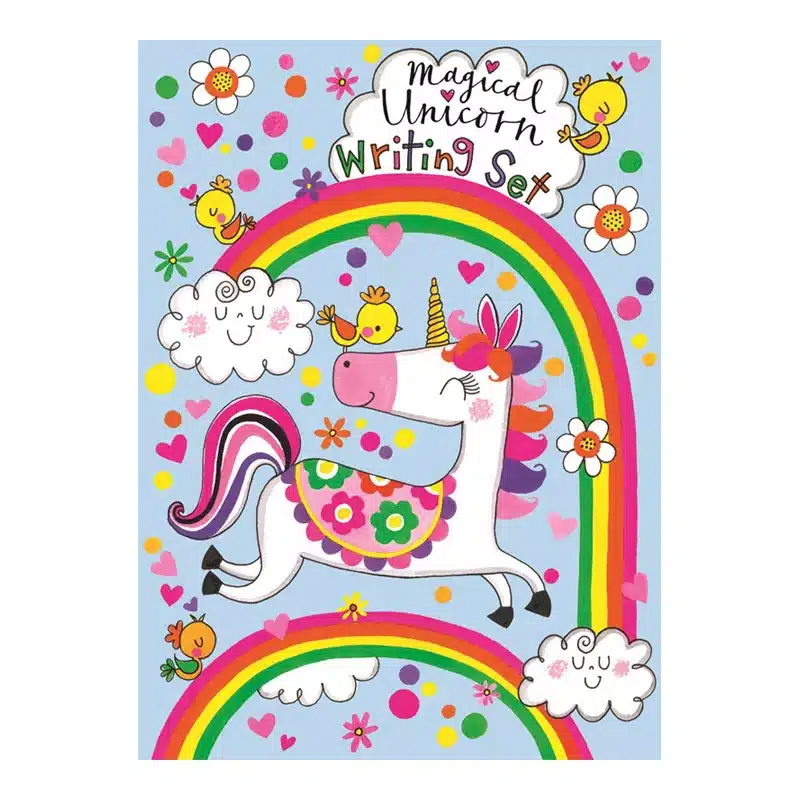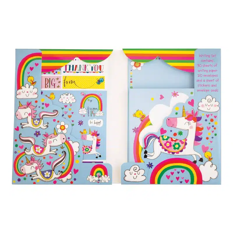 Bien presentado en una carpeta con solapas que permite ver el contenido. Diseño de unicornio mágico.