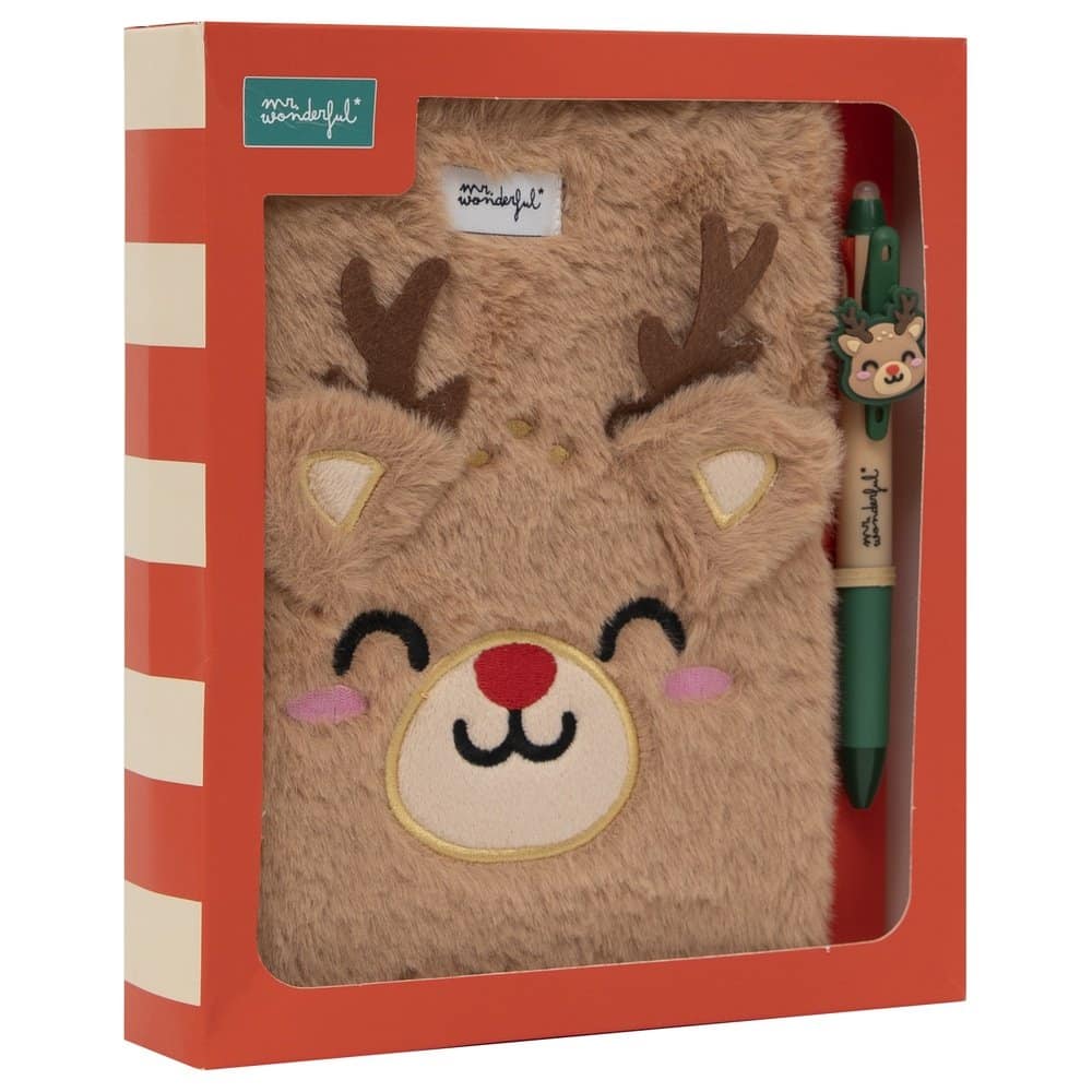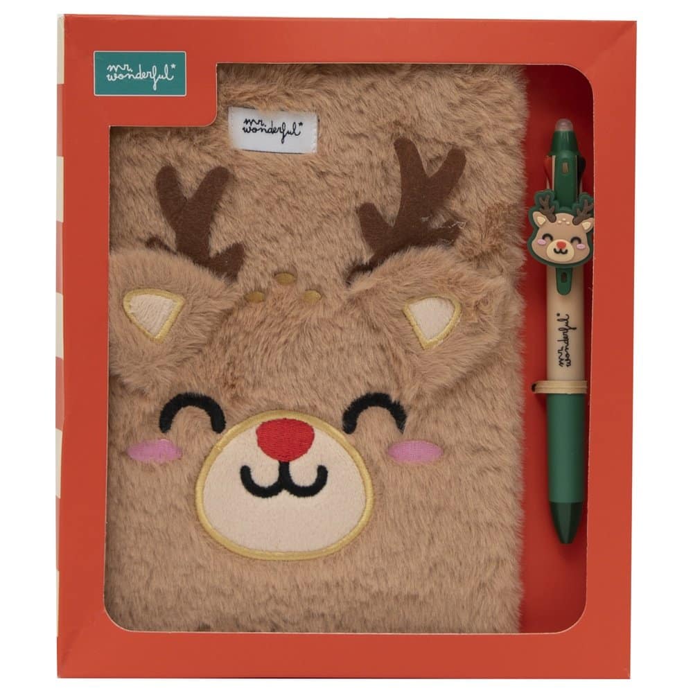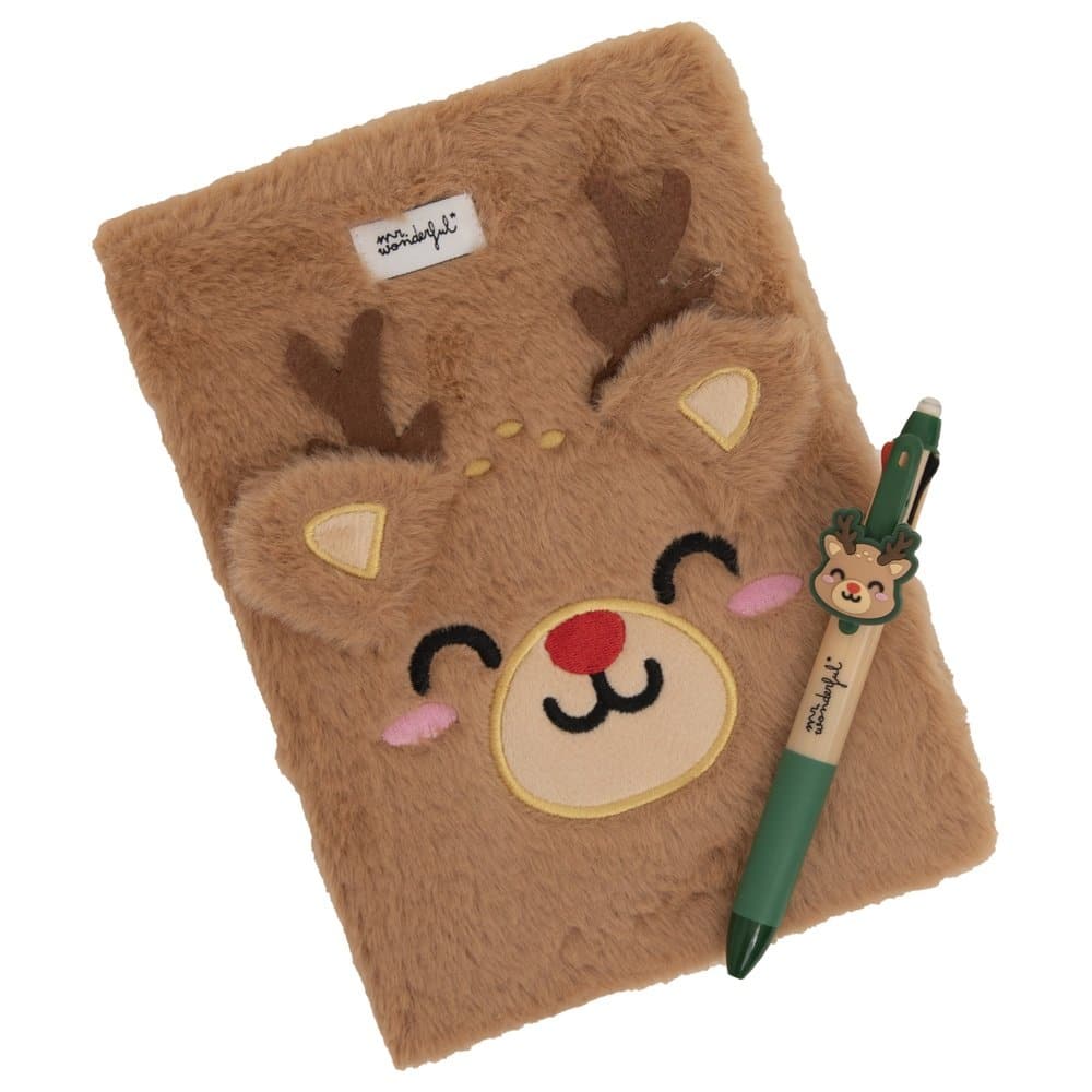 Set de regalo compuesto por una libreta de tamaño A5, con portada forrada en poliéster imitando borreguito y con forma de cara de reno navideño, y un bolígrafo multicolor con la cabeza del mismo reno. La libreta tiene encuadernación cosida que permite una apertura de 180º y cuenta con xxx páginas xxx, con certificación FSC, que garantiza que han sido fabricadas con papel proveniente de bosques gestionados de forma responsable