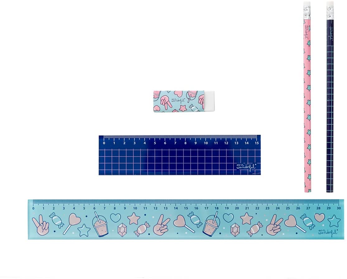 Un bonito y práctico set que incluye lo siguiente: una regla de 30 cm, una regla de 15 cm, dos lápices y una goma de borrar.