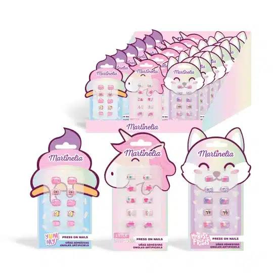 Un set de uñas postizas con diseños encantadores, perfecto para que los niños y niñas exploren su creatividad de forma lúdica y segura.