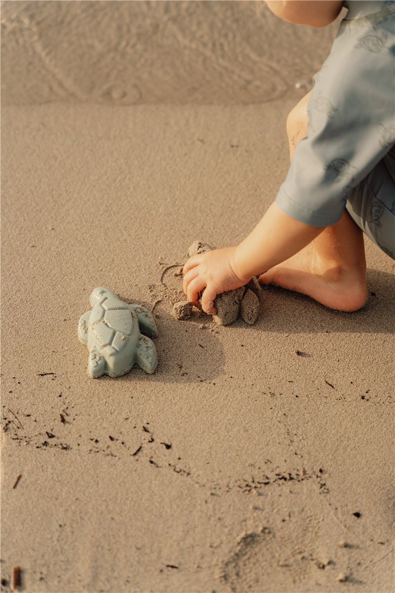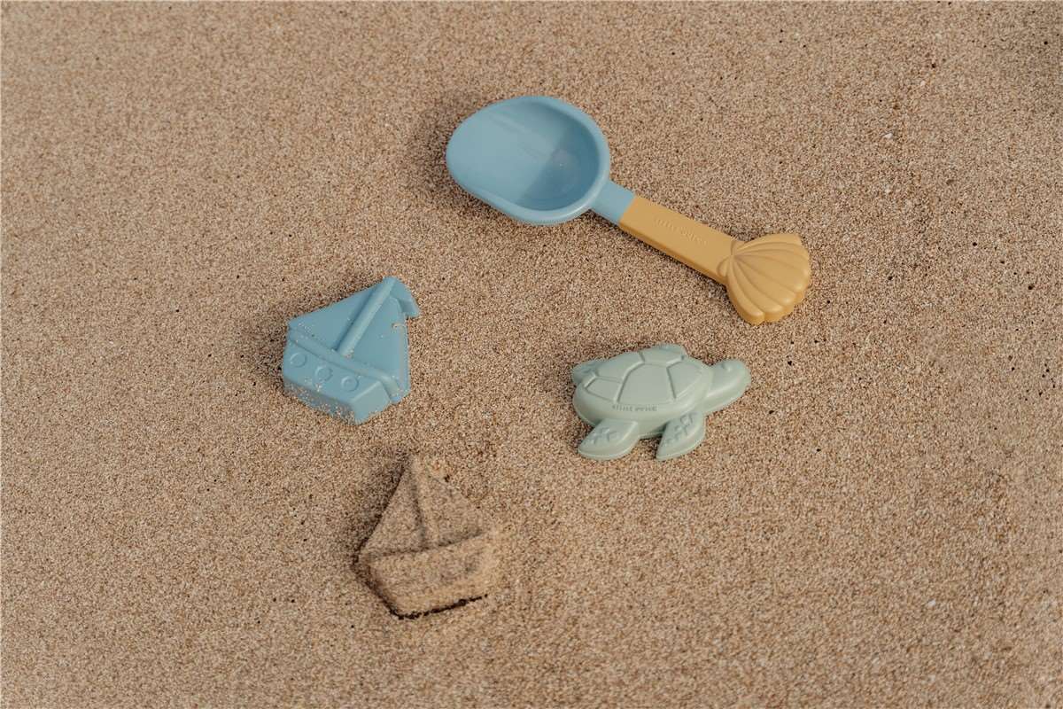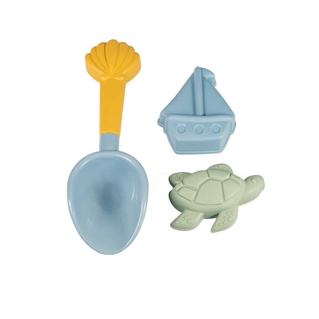 Este conjunto incluye una pala y dos formas de arena: una tortuga y un velero azul. Todo pensado para que las manos pequeñas tengan un buen agarre y mucha diversión y jueguen con la arena.
