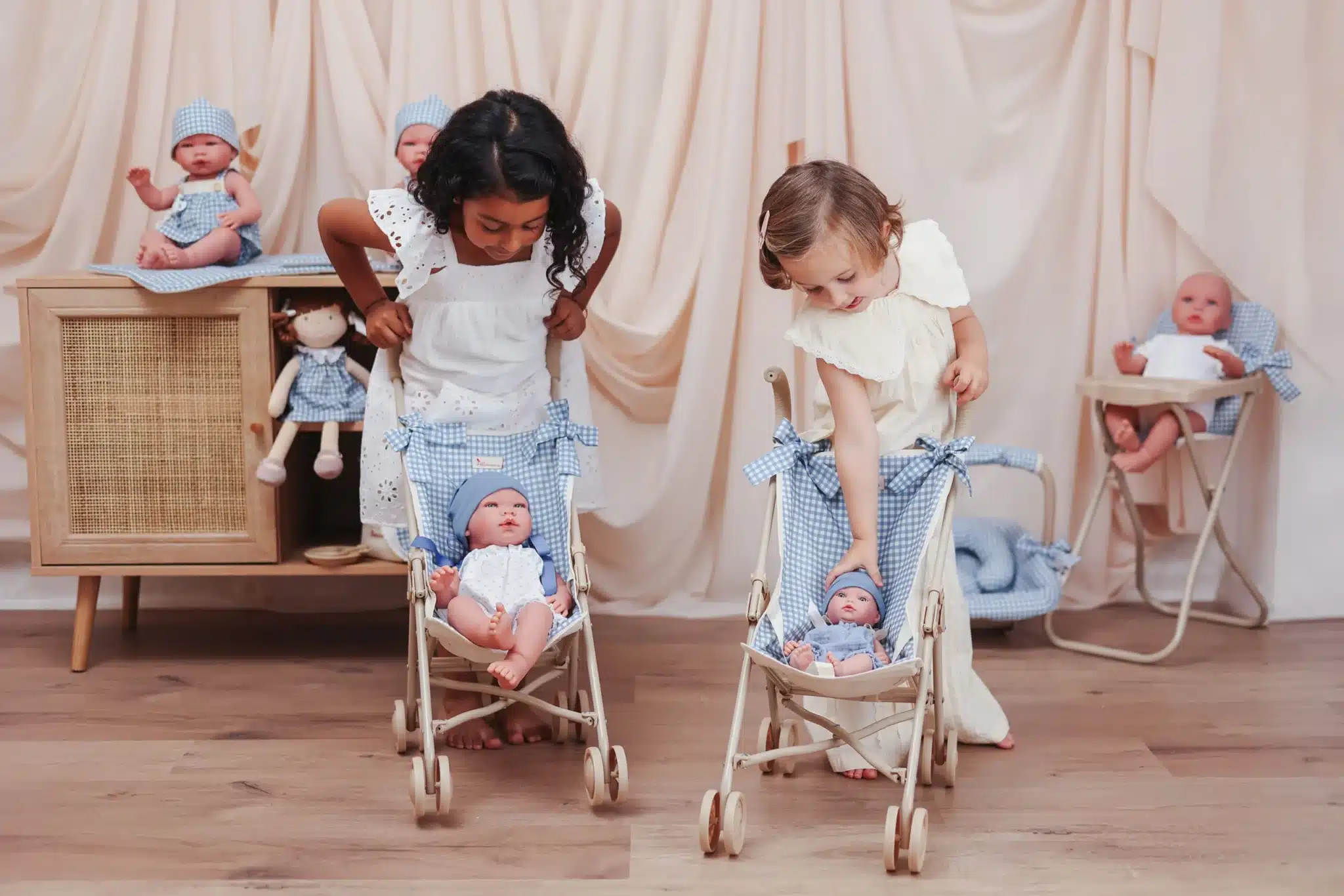 Toda la estructura está lacada en color beige, con ruedas y asas de espuma en tonos a juego para un agarre suave y confortable. La tela, fabricada en algodón resistente, incorpora un volante doble que aporta un acabado elegante y delicado. Para completar la experiencia, incluye una bolsa a juego ideal para guardar accesorios y mantener todo organizado durante el paseo.