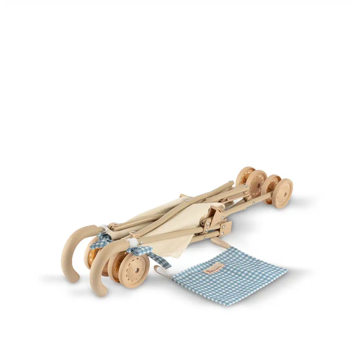 Su manillar de 56 cm ofrece una altura ideal para los más pequeños, permitiendo un manejo cómodo y natural. La estructura metálica lacada en color beige, junto con las ruedas y asas de espuma a juego, aporta un diseño suave y elegante. La tela de algodón incluye un delicado volante doble que añade un toque distintivo. Para completar el conjunto, incorpora una bolsa a juego perfecta para transportar todos los accesorios del muñeco.
