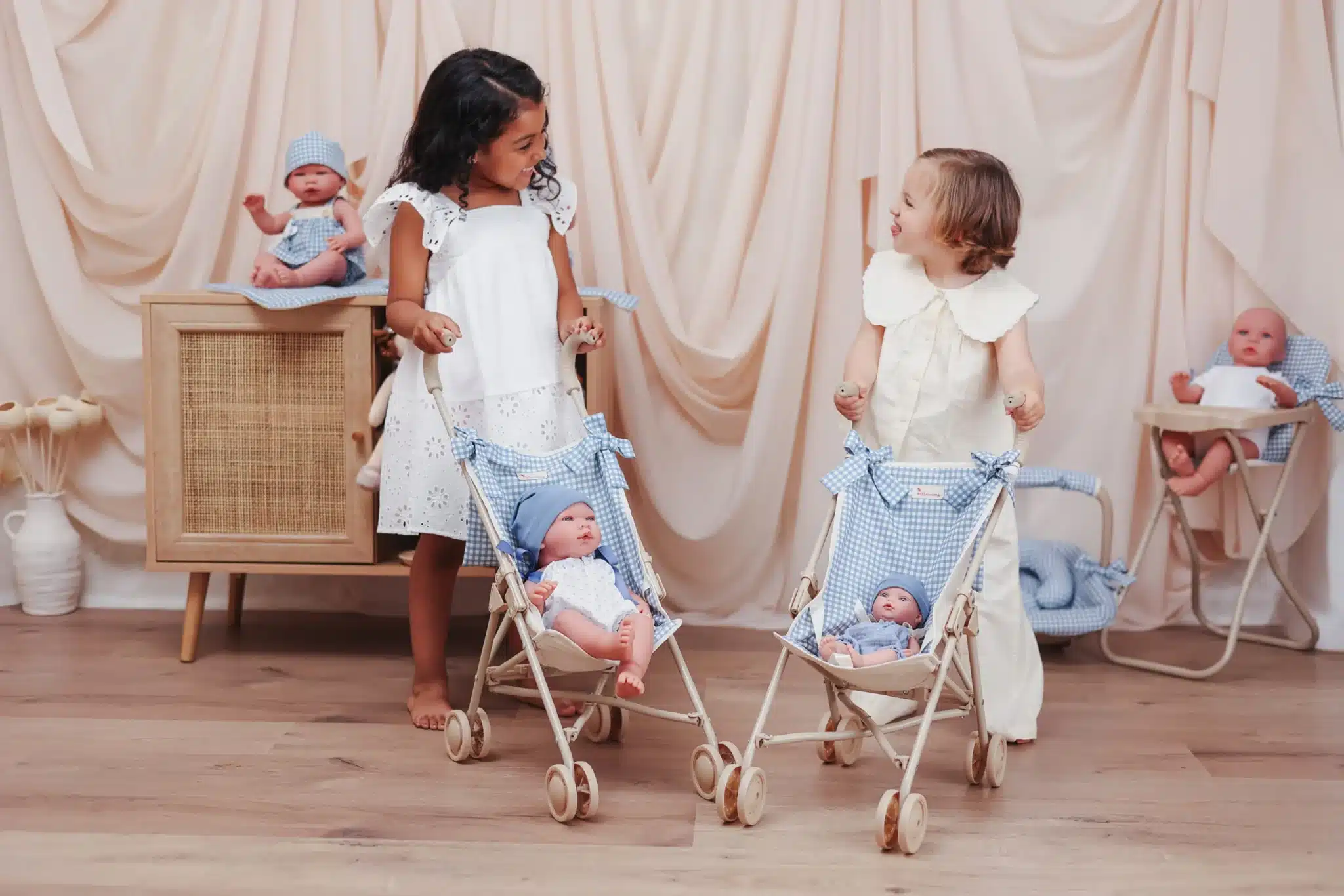 Niños y niñas a partir de 3 años que disfrutan del juego simbólico, del cuidado de sus muñecas y de recrear paseos y rutinas diarias.