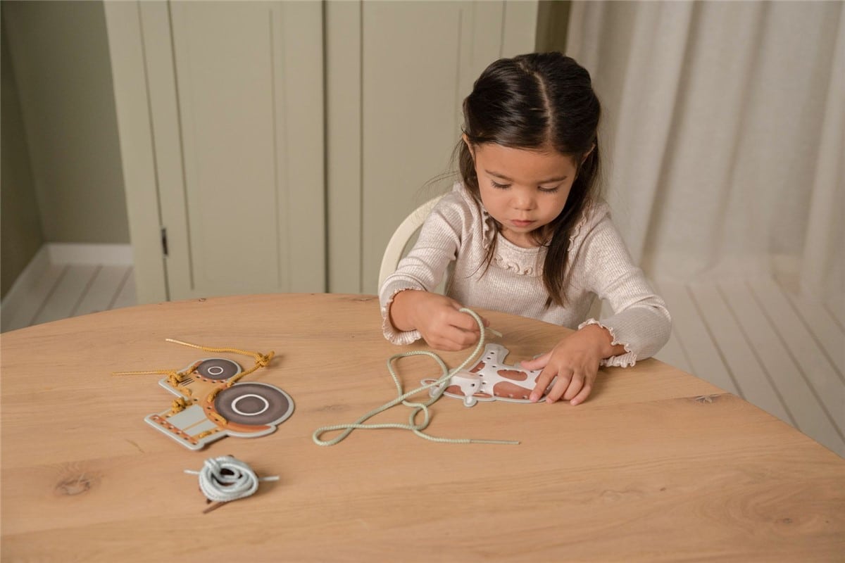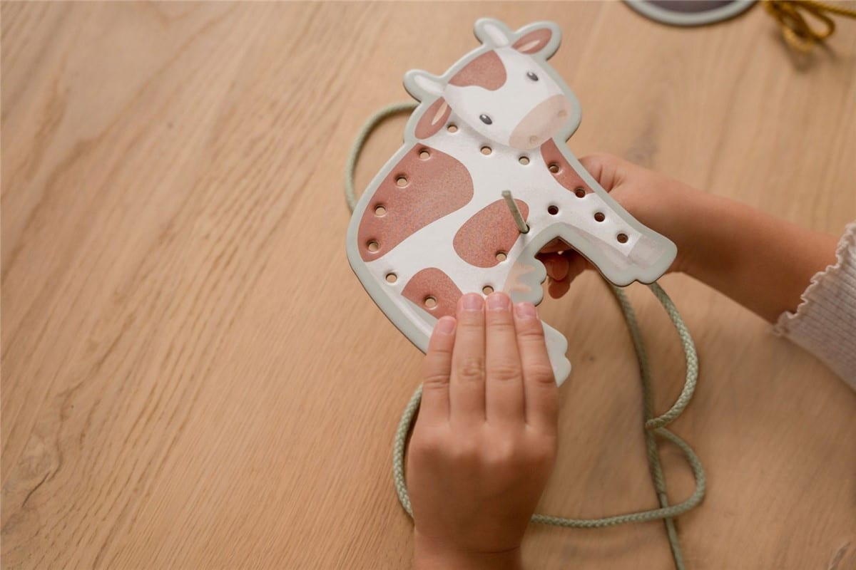 Aprende como enlazar estas tarjetas de cartón de Little Dutch. Este set consiste en 5 grandes y robustas tarjetas de cartón con imágenes de vaca, gallina, oveja, tractor y granja de la colección Little Farm, sirven para el desarrollo de las habilidades motoras finas. Incluye cuatro cordones de diferentes colores para enlazar.